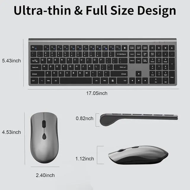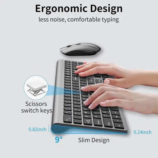 The calculator buttons allow you to quickly open the computers calculator program, saving you valuable time ^^ Ultra Thin & Ergonomic Design- The thin wireless keyboard has 110 keys and accommodates most typing habits while taking up less space than traditional full-sized keyboards. Its ultra-slim and streamlined shape adds a classy and minimalist touch to your small desktop. The ergonomic full size keyboard has a tilt angle for more comfortable typing and improved work efficiency ^^ Silent Keyboard and MouseAll keys on the office keyboard use scissor structure switches, making the keyboard ultra-thin, lightweight, responsive, noise free, and typing soft and comfortable.
