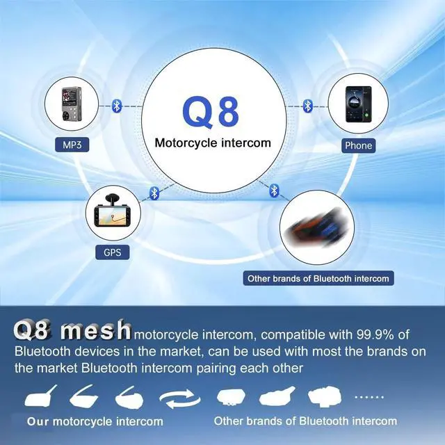 Helmet communication system also has a function to share music with teammates, which is very suitable for close teammates and makes the journey more interesting ^^ Have Motorcycle Headset Ever Been On Strike During Snowmobiling And Skiing? -This Q8 intercom earphone is designed specifically for harsh weather conditions ranging from -20 to -10, providing you with a safer and more convenient outdoor riding experience. The built-in 1200mAh high-capacity battery is twice the capacity of the intercom headphone battery on the market. The standby time is 230 hours, and it can play music for 29 hours ^^ Professional Waterproof, Dustproof, Windproof, And Noise Reducing -the speaker emits high -quality stereo sound, and can communicate clearly even at speeds of 140 yards per hour and 80 miles/h.