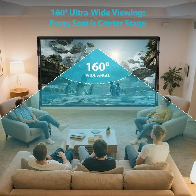 WRINKLE-FREE HD VISUALS: Engineered with heavyweight 200g milk silk polyester, this 100" screen stays flawlessly smooth after repeated folding and washingno creases, no distractions. The thickened fabric delivers 30% better light reflection than standard screens, boosting clarity for both 1080P and 4K content. With 1.5 x gain and a 160 wide viewing angle, enjoy vibrant daytime viewing. perfect for indoor home theaters or backyard movie nights under ambient light.