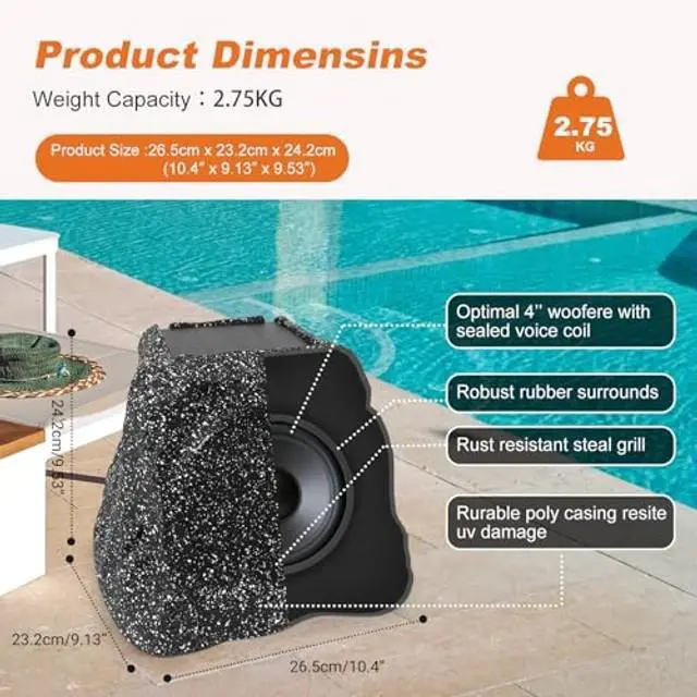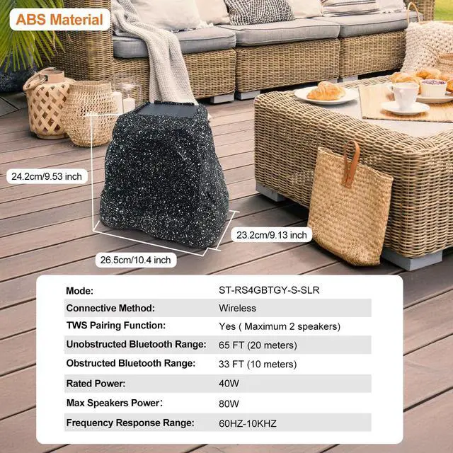 Solar & Type-C RechargeableOutdoor rock speaker equipped with a high-performance battery. Supports both solar and Type-C charging. Type-C charging takes just 2 hours. Playback time varies7 hours at 80% volume, 5 hours at maximum volume, and even longer at the lowest volume setting, all based on sunlight exposure. ^^ Bluetooth 5.3 & TWS PairingThis speaker uses Bluetooth 5.3 for quick pairing up to 49ft. Features TWS mode, enabling sync of multiple same-model speakers for stereo sound. Ideal for outdoor spaces, letting music flow smoothly. ^^ Tough & WeatherproofCrafted with sturdy materials and IPX7 waterproof rating, this speaker thrives in outdoor settings.
