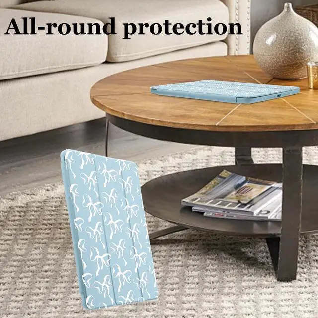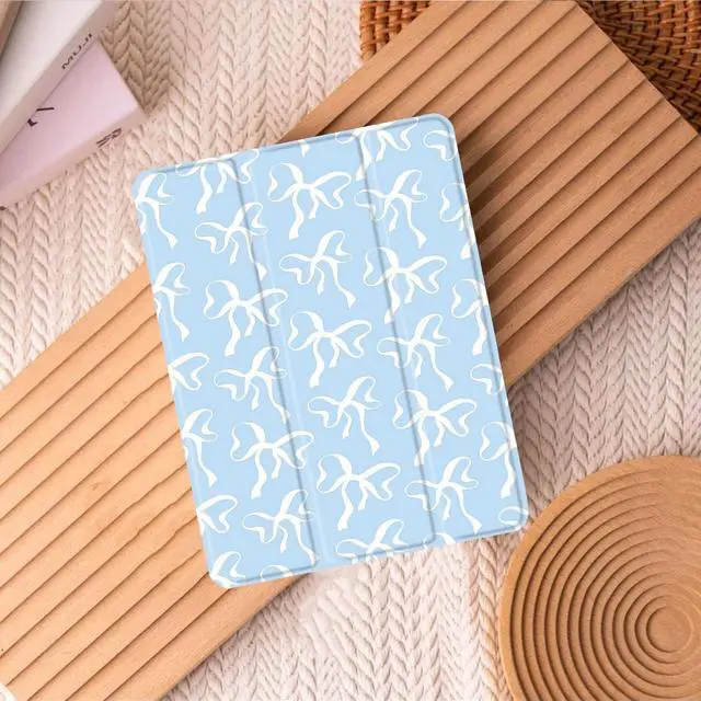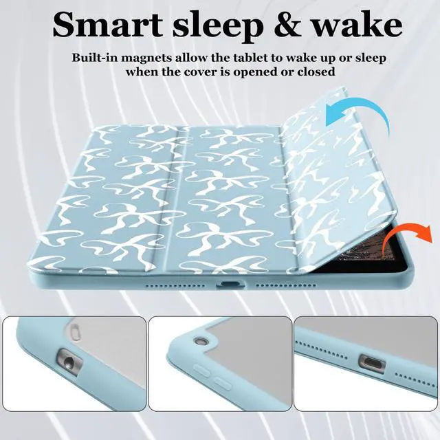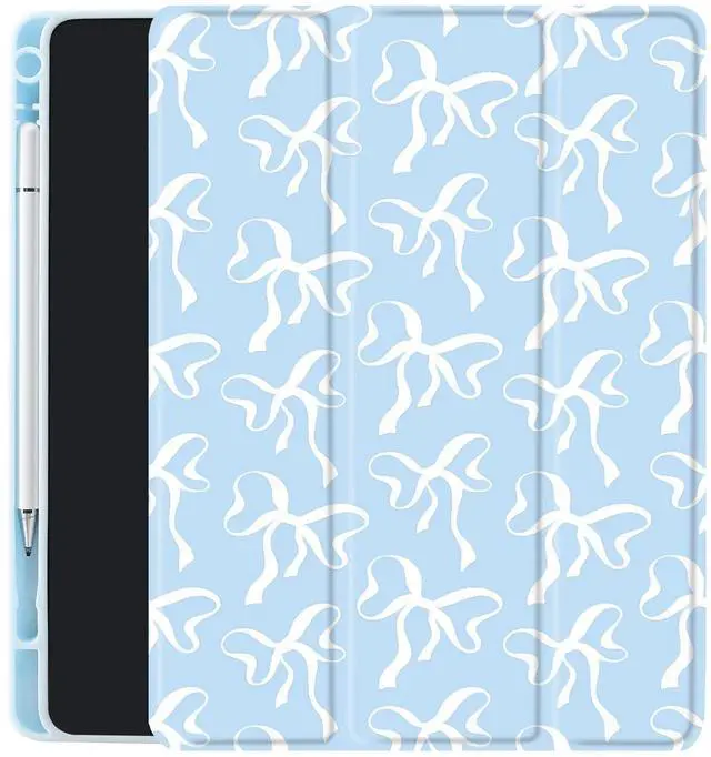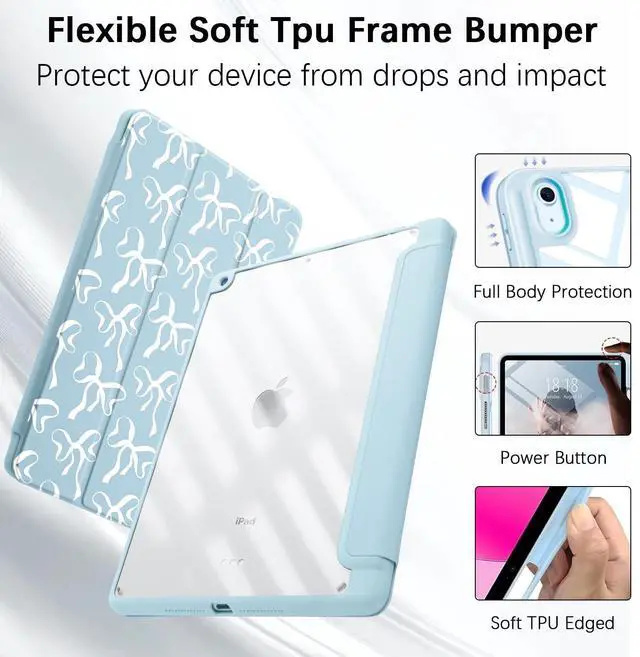 Model: A2696, A2757, A2777). ^^ Full Body ProtectionThis blue white ribbon case for ipad is made of comfortable soft silicone &Transparent anti drop acrylic back shell. The back of this kawaii girl bow pattern case for ipad provides full body protection and is more durable than traditional silicone materials. Our cute trendy Case is less prone to yellowing, prevents scratches, and maximizes the protection of your pad from damage and scratches ^^ Auto Sleep / WakeThis cute trendy Shell Support auto Sleep/Wake feature. Built-in magnetic strip, automatically wakes or puts your tablet to sleep when the lid is opened and closed. Protects and extends battery life. The blue white ribbon Cover with pencil holder, Easily hold your pencil and charge it.
