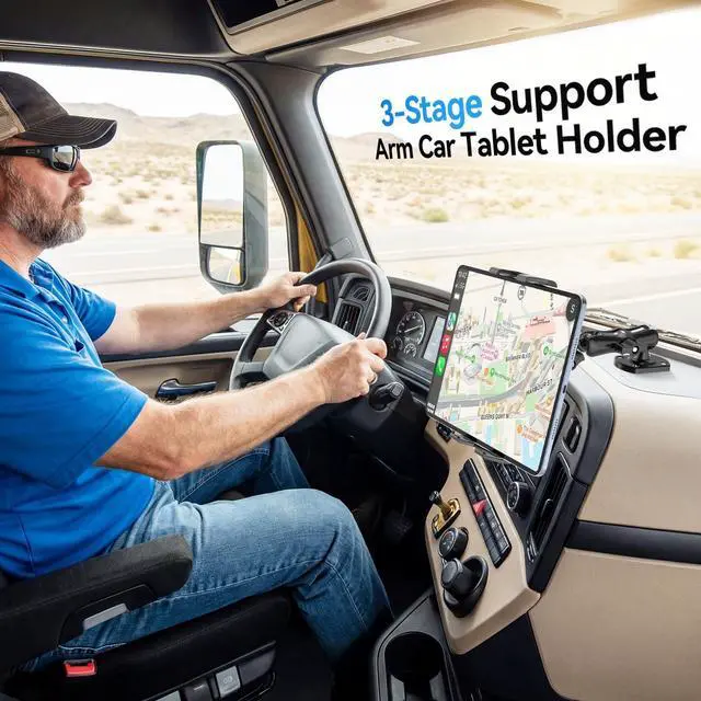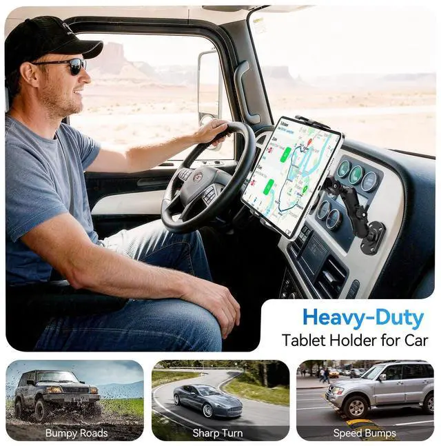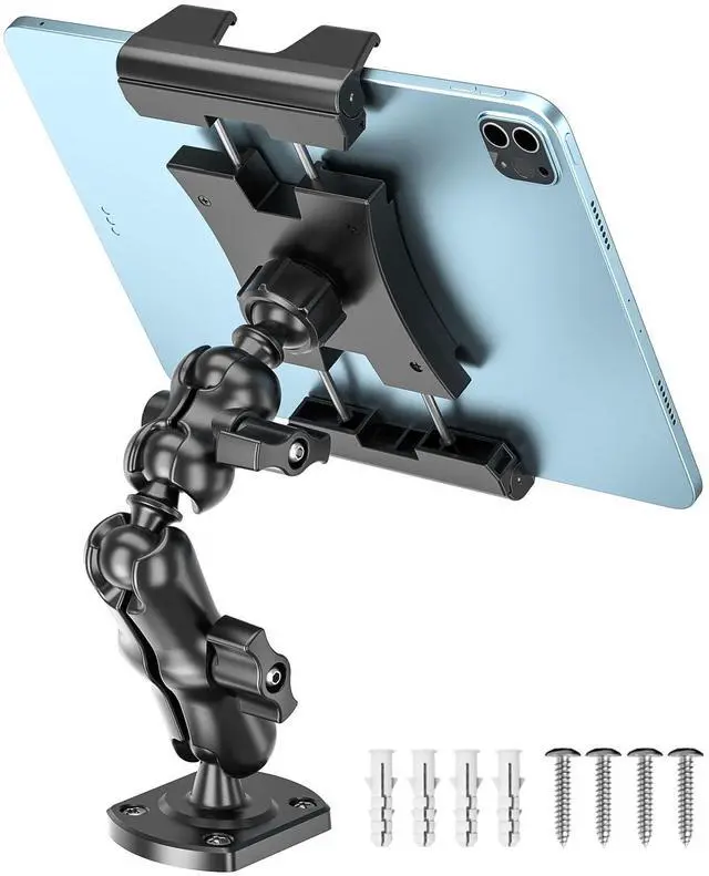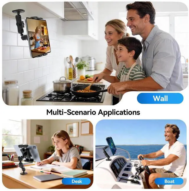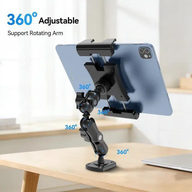 ^^ Multi-Scenario ApplicationThe ipad car holder Designed for demanding environments. Suitable for vehicles like trucks and construction machinery, it can also be securely mounted on any flat surface, including walls, desks, and kitchen counters. It's ideal for factories, warehouses, kitchens, gyms, control rooms, and more. ^^ 360 Omnidirectional View SystemThe core of this tablet mount for truck lies in its dual flexible design of "universal 5 ball joints +2-stage arm". Each ball joint is an independent universal joint, enabling 360 rotation. This allows the holder to bend and position itself on virtually infinitely complex spatial trajectories.