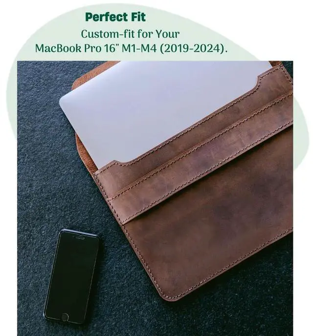 Perfect Fit - For Apple MacBook Pro 16 Inch Case M1, M2, M3 & M4, from 2019, 2021, 2023 & 2024. ^^ Super Slim & Protective - Our MacBook Pro 16 Inch Bag is made of thick pull-up leather with nubuck interior. No inlays slim, strong, and perfect for any bag. ^^ No Pressure Points - Simple leather flap. No zippers, no hardware, no wear. MacBook Pro 16 Inch Cover with clean look with zero pressure points. ^^ Handmade to Last - Hand-stitched with care.