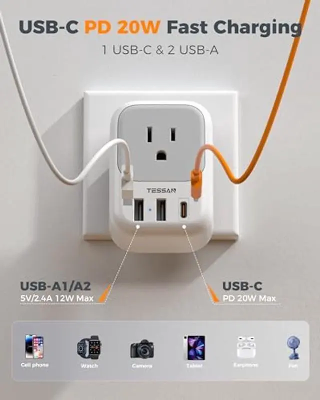 Power Adapter: The japan charger adapter features 4 AC Outlet (1875W Max), 1 USB C (3A Max per port) and 2 USB A ( 2.4A Max); Japan outlet adapter can charge 7 devices simultaneously, reducing waiting time and no need to bring extra adapters ^^ USB C 20W