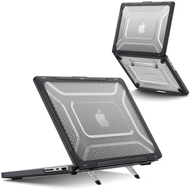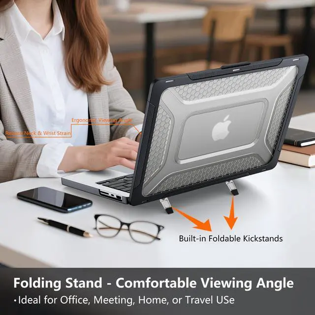 The integrated foldable stand provides rock-solid triangular support at an optimal angle. Unlike flimsy alternatives, ours is reinforced for long-term durability, making it ideal for professional work, meetings, or travel without needing an extra stand ^^ [Enhanced Heat Dissipation] Optimized for high-performance tasks. The honeycomb bottom features expanded ventilation slits to improve airflow, helping support effective cooling during intensive tasks such as video editing or gaming to help maintain system efficiency ^^ [Modern Aesthetics & Fingerprint-Resistant] The translucent honeycomb texture adds a sophisticated look while keeping the Apple logo visible. The high-quality matte finish is fingerprint-resistant, which helps keep your MacBook looking clean and professional in any office, home, or travel environment