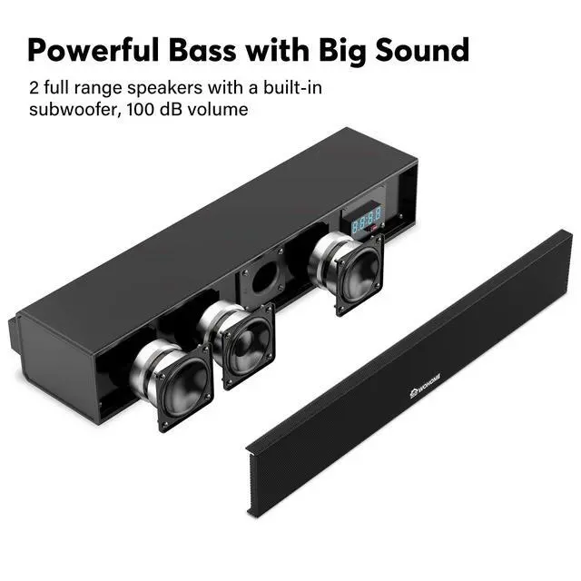 Built-in subwoofer for deep bass: Sound bar features a powerful 2.25 -inch subwoofer that delivers rich, immersive bass ^^ Compact size, big