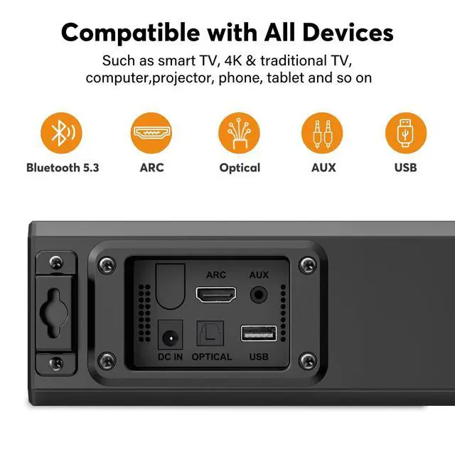 Versatile connectivity: TV sound bar works with Bluetooth 5.3, ARC, Optical, AUX, and USBcompatible with your smart TV, 4K and traditional TV, computer, projector, phone, tablet and so on; TV remote will control the sound bar volume and power on/off when the soundbar and tv use ARC connection ^^ 3