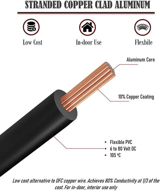 Color Set: Red Black Blue Yellow White Green. ^^ Single Conductor 18 gauge wire automotive, Stranded Copper Clad Aluminum ( 0.25 mm dia/strand, 13 strands) Insulated in flexible PVC electrical wire. This automotive wire 18 gauge is rated at 221 F/ 105 C. ^^ CCA wire is low cost, lighter and more flexible than copper wire. This flexible 18 gauge automotive wire is perfect for 12 volt wire. 12V low voltae auto wire is made of top quality Copper Clad Aluminum.