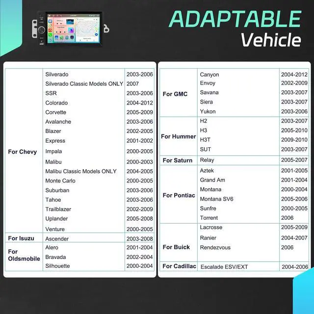 Chevrolet Chevy Silverado GMCCompatible vehicles: for Chevrolet Chevy Silverado Tahoe Suburban Avalanche SSR 2003-2006, for GMC Canyon 2004-2012, for Savana Sierra 2003-2007, for Yukon Envoy, for Hummer H2 2003-2007 H3 H3T SUT. This car radio with 7 inch 1080P HD capacity touch screen. Memory 6 GB (RAM) + 128 GB (ROM). Support split screen. Car radio with canbus for real-time synchronization of car information. ^^ Wireless/Wired Carplay & Wireless/Wired Android Auto For Chevy Silverado android car radio can choose a wired or wireless connection to Carplay or Android Auto, connect to an IOS cell phone, access the cell phone's address book, emails, notifications, map navigation, music, videos and other information, and realize voice control. The Android Auto can control the user's Android phone, access the cell phone's address book, music, etc. ^^ GPS Navigation & WIFI & Android SystemFor Chevy Silverado Car Radio with Android system. Navigate precisely and easily with the integrated GPS module that supports online and offline maps. You can also use voice guidance and real-time traffic information. Built-in WIFI, Connect to the internet via WIFI browse the internet, stream online content, download apps and much more on the device e.