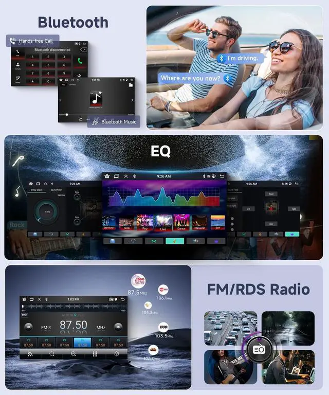 Car Radio Android Support steering wheel control, so you can control the functions you need through the steering wheel, which is more convenient. ^^ Optional Purchase No FreeSupport reversing camera/driving recorder/MIC. This helps you park safely and avoid obstacles. You can also connect a driving recorder to record your driving journey. Use the built-in voice assistant to control the device and access various functions. You can ask questions, get directions, check weather, play music, and more with natural language. Support AI DSP, Eight mainstream sound effects designed for car scenes create the ultimate hearing experience.