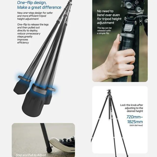 a great difference: New one-step design for saferand more efficient tripod height adjustment. One-flip to release the legs and then pulled out directly to deploy, reduce unnecessary steps, greatly improves efficiency ^^ Center Column Mode, Multi-Angle