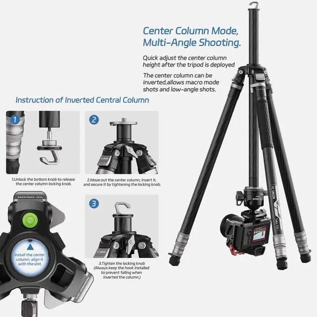Shooting: Quick adjust the center column height after the tripod is deployed. The center column can be inverted, allows macro mode shots and low-angle shots. ^^ Lower shooting angle, Redefining