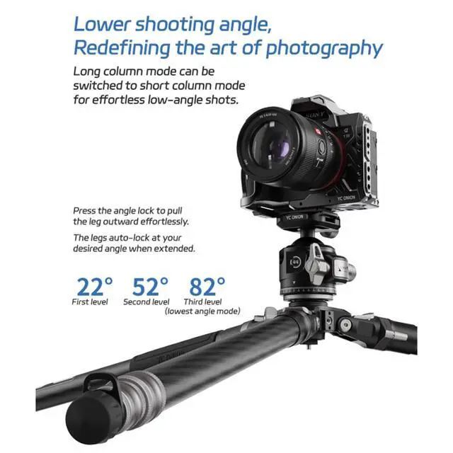 the art of photography: Long column mode can be switched to short column mode for effortless low-angle shots. Press the angle lock to pull the leg outward effortlessly. The legs auto-lock at your desired angle when extended. ^^ Complete Experience, Ultimate