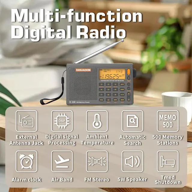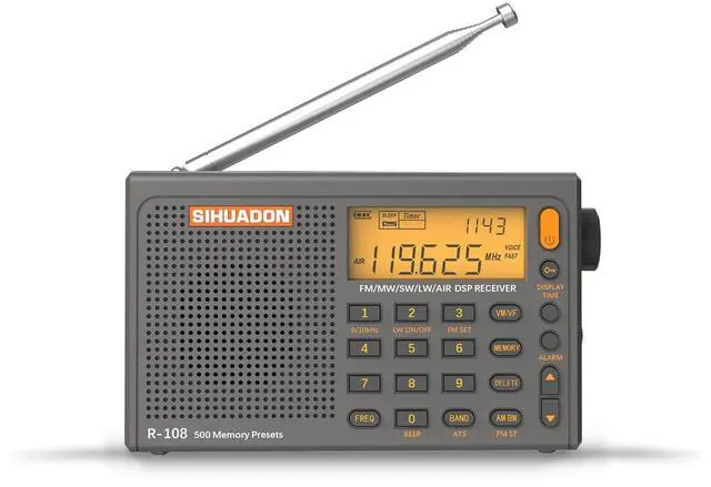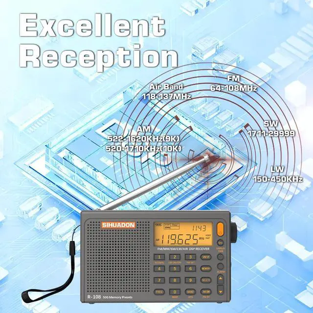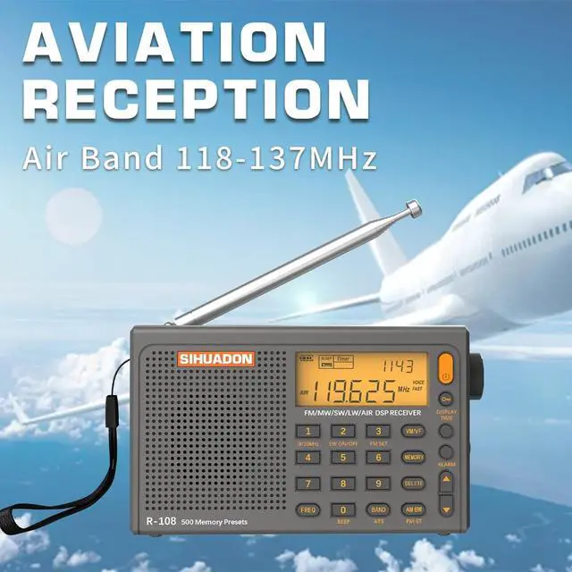 Enhanced Reception & Multi-Band Tuning: Built with a DSP chip and telescopic antenna, this portable radio supports wide signals in FM(64-108MHz), AM (520-1710kHz), SW(1711-2999kHz) and AIR(118-137MHz) bands so you can follow local news, music, and air band broadcasts at home, in the workshop, or at a campsite with the radios portable am fm. You can manually tune to different stations in the fm radio for stable listening in a variety of environments.