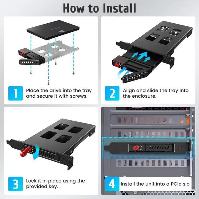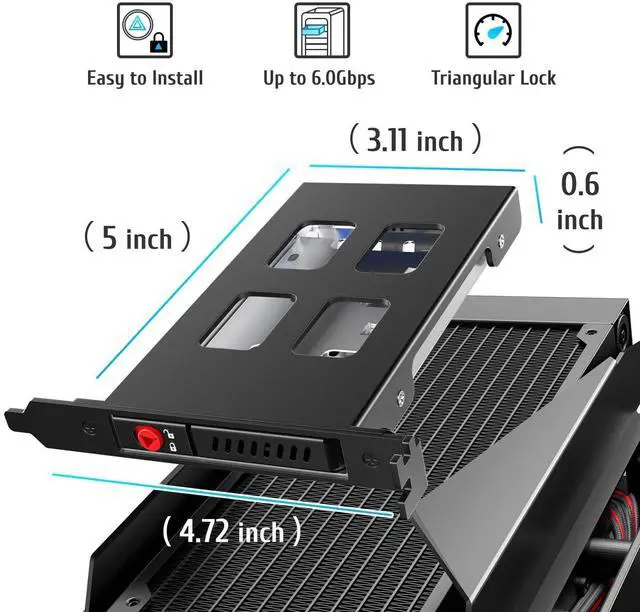Fits all 3.5 inch SATA hard drives in a front-accessible 5.25 inch PC drive bay.