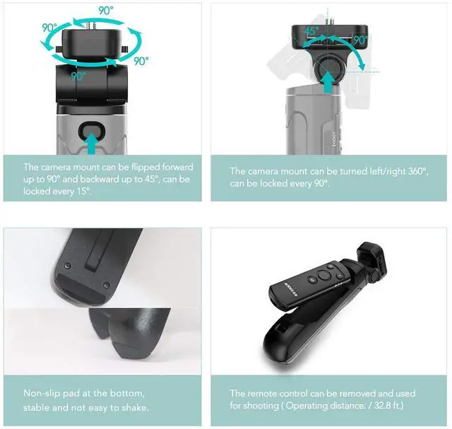 Left and right direction: Can rotate 360 degrees, rotate to 90 lock, it can provide stable shooting. ^^ [ Stable without Shaking ] - When used as a tripod, the bottom is equipped with a non-slip pad, which can increase the friction with the supporting surface, which is stable and does not shake during shooting, ensuring a clear picture.