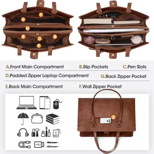 Makeup bag size: 7.9"L x 4"W x 4.4"H. Short handle drop 6.3" and long handle drop 11.6", dual top handles design help you carry more comfortably. Adjustable and detachable shoulder strap is 27-48 inch long, providing you with diverse carrying ways. It's a universal size so it fits for most 13"/14"/15"/ 15.6" laptops. Spacious and lightweight laptop bag for women, large enough to keep all your daily supplies well organized. ^^ Multi-pocket Laptop ToteUnique 3-compartment design makes this computer bag meet your different needs. The separate padded pocket with zipper in the middle holds up to 15.6" laptop with full protection. 2 main compartments with magnetic buckle closure for iPad, A4 files and books. 2 internal slip pockets, 1 wall zipper pocket, 3 pen slots and 1 external back zipper pocket for card and wallet. Blending security with ease of use, this laptop bag for women is the perfect everyday work bag. ^^ Versatile Computer Bag for WomenThe laptop bags for women comes with a adjustable detachable shoulder strap and 2 top handles of different lengths, perfect for different body type. Ideal laptop tote bag for daily use at shopping, office, college, business trip, work, outdoor activities, travel, gyms and other occasions as a handbag, laptop bag, teacher tote bag, computer bag, college shoulder bag, ladies briefcase, crossbody work bag and business messenger bag.