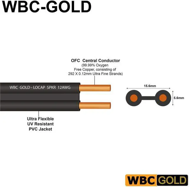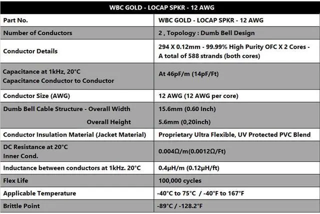 WBC-GOLD Cable Range is introduced as a must for the discerning individual beginning his journey as an Audiophile. A perfect marriage between Audiophile Quality and Affordability, the WBC-GOLD cables are the ideal stepping-stone into the world of high-quality audio experiences without breaking your bank. Coming directly from our factory, which allows us to offer jaw-dropping price levels, the cables boast the Legendary WBC Performance and Assembly Quality that is Built to Last a Lifetime! ^^ The WBC-GOLD-LOCAP-SPKR-12AWG consists of a total of 588, 99.99 % Highly-Pure Oxygen Free Copper (OFC), 0.12 mm fine strands divided equally between two 12AWG cores laid out in an expanded dumbbell speaker cable design.