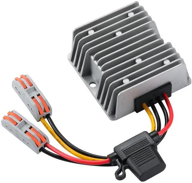 black(-)Output: yellow(+) black(-)Protection against transient high voltage at input, protection against overcurrent at output, protection against overtemperature at chip. DC voltage regulator safety manual1. the load connected to the output of the power regulator should not be higher than the MAX LISTED LOAD POWER, any higher load will cause damage to the power regulator. 2. in the process of use, if the ambient temperature is too high, should be appropriate to reduce the use of power, low-temperature operation is a guarantee that the power supply can work reliably for a long time. Cautions1 Can not be reversed, the power supply does not have reverse connection protection, please connect the wires correctly, reverse connection will damage the power supply2 The use of the process can not be overloaded load, leave a margin for the power supply to ensure long-term stability of the power supply work3 In the process of use, if the ambient temperature is too high should be appropriate to reduce the power to use, low-temperature work is the power supply can be long-term reliable work to ensure that properly functioning. Package Includes1x DC to DC Voltage Converter 9V-32V to 12V 10APlease feel free to contact us if you have any questions with installation or quality.