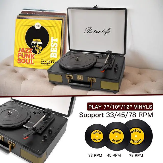 Belt Driven Three-Speed Turntable: This three-speed (33 1/3, 45, 78 RPM) portable turntable features premium upgraded sound quality. It also supports 3 sizes of vinyl records, 7/10/12 inches. If you have records of multiple sizes, try our portable record player instead, which can meet your diverse size needs ^^ Four Advanced