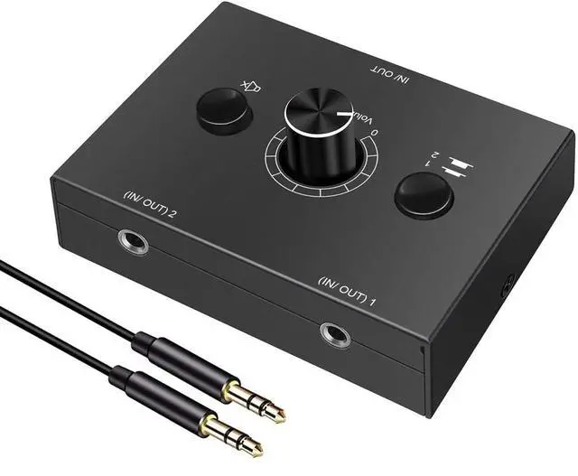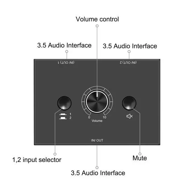 2-IN-1-OUT Mini 3.5 mm Audio selector designed for customers having several audio sources and outputs ^^ Select audio input between 1 and 2 with 1/2 switcher and get one output ^^ Select audio output between 1 and 2 to receive one input ^^ One key to Mute; very useful under special conditions ^^ Plug and Play; No power needed; Won't affect sound quality.