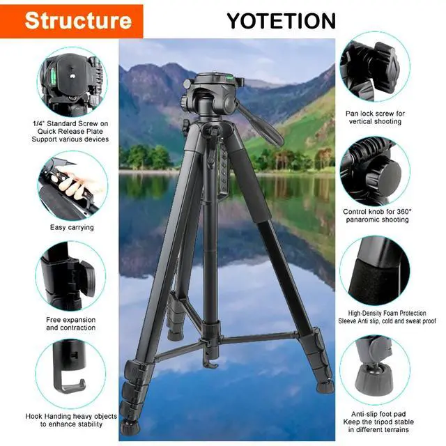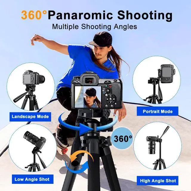 Head: Thefluid head pans 360 horizontally and tilts vertically from -70 to 90, giving you the perfect shooting angle and enhanced shooting experienceAdjustable shaft: Very smooth. When the tripod is fully opened, the height can be raised and lowered by releasing the axial twist; The bottom hook of the center shaft allows for the suspension of other items such as camera bags for added stability.