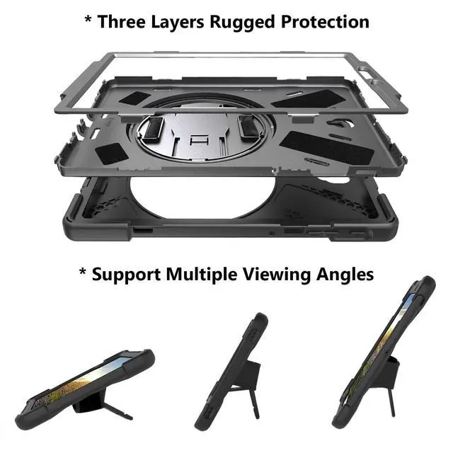Material Composition: Premium Hard PC Inner + Soft Silicone Shell material design, Three layer structure provide Perfectly protects device against from fingerprints, scratches, shocks and dust, Protection against drops and bumps. Providing a firm grip and guaranteed durability to extends the use age. ^^ Precise Cutting & Handle Shoulder Strap- Full access to all features. Accurate Hole of Cameras, Ports and Buttons without remove the case Also Thickened protection at all four corners. Soft Handle strap with 360 Degree rotating design provides Three angles viewing, Adjustable shoulder strap attaches any 2 holes of the case to carry your device vertically or horizontally like a messenger bag / neck bag / sling / harness or holster. ^^ Portable & Three Viewing Angles- Portablet Heavy Duty Protective Case, Easy Installation and Removal, 360 Degree rotating design transforms case to be standing with three comfortable position angles, viewing angle and typing angle. A nice option when Browsing videos or following a recipe when cooking in the kitchen. Conveniently watch movies, play games, read favorite EBooks, draw, type and chatwherever and whenever. ^^ Package Lists & Service- 1*Tablet Case + 1*Stylus Pen (11cm* 0.8 cm) + 1*Shoulder Straps.