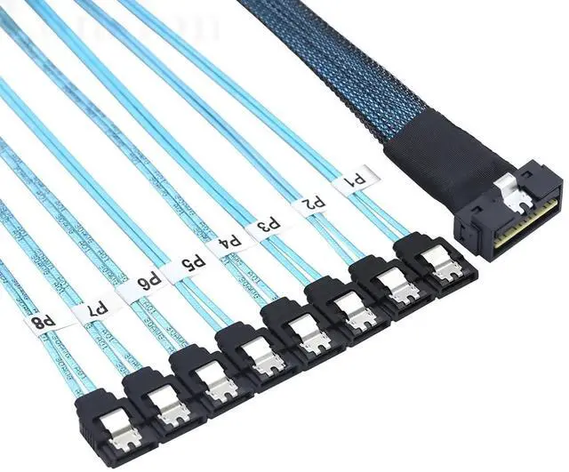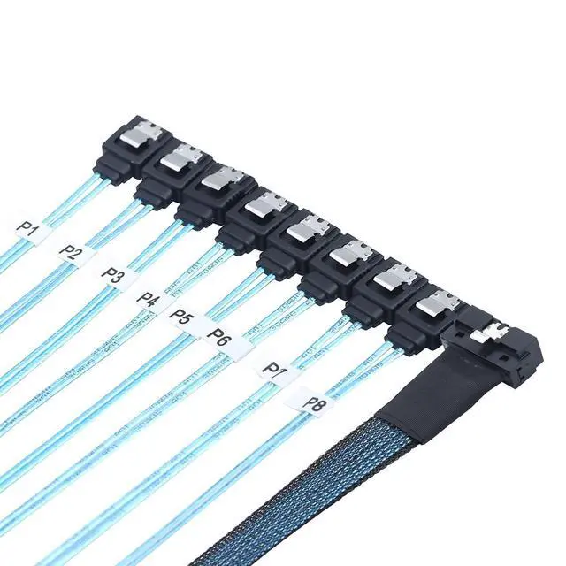 Length: 0.5 m, 0.8 m, 1.0 m (optional) Product DescriptionHigh-Performance PCIe SlimSAS CableThis PCIe SlimSAS LP Low Profile SFF-8654 8i 74 Pin to 8 SATA server cable is designed for professional server and storage systems. Supporting high-speed data transfer with 100 ohm impedance, it ensures stable and efficient performance in enterprise IT environments. Durable 30AWG Wire ConstructionBuilt with 30AWG premium wiring, this SlimSAS to SATA cable guarantees signal integrity, low loss transmission, and long-term reliability. The flat connector design provides a secure connection for stable server operation. Connect up to 8 SATA DevicesWith one SlimSAS 74P interface to eight SATA connectors, this cable allows IT professionals to expand server storage with ease, making it an excellent solution for RAID controllers, motherboards, and enterprise data centers. Flexible Length OptionsAvailable in 0.5 m, 0.8 m, and 1.0 m, this cable offers flexibility for different server installations, from compact cases to rackmount systems. Enterprise-Grade ApplicationsWidely used in servers, storage arrays, RAID controllers, industrial IT systems, and high-performance computing, this SlimSAS cable provides professional reliability for demanding environments.