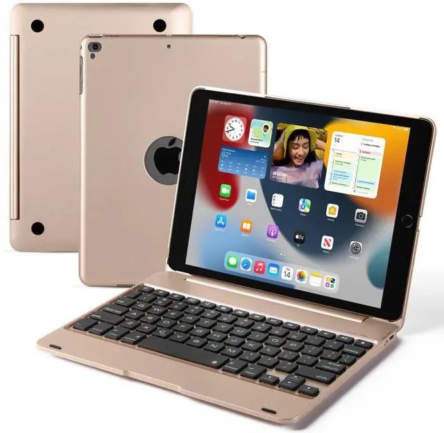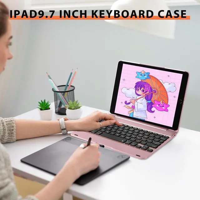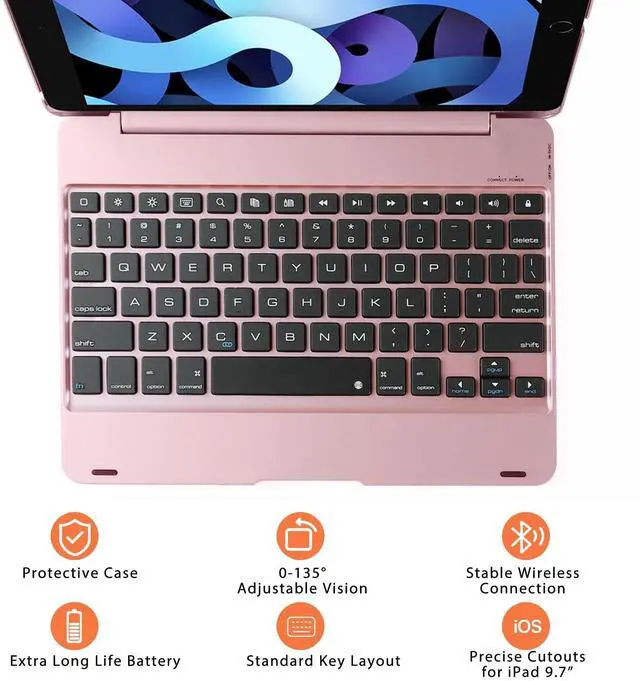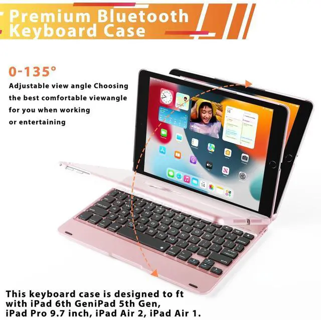 CompatibilityThis iPad keyboard case was designed to fit 2018iPad 6th Generation(model A1893 / A1954), 2017iPad 5th Generation(A1822 / A1823), iPad Pro 9.7 inch(A1673/1674 /A1675), iPad Air 2(A1566/A1567), iPad Air 1(A1474 / A1475 / A1476). This keyboard case is specially made for iPad 9.7 inch. Please be kindly check the MODEL NO on the back of your iPad before purchasing. ^^ Typing & 135 Adjustable Angle Thanks to our ABS tap keys Comfortable to touch, our keyboard will offer you smooth typing experiences. The ipad 9.7 inch case with keyboard rotates 135 Adjustable Angleoffering multi-angle viewing, you can adjust the screen to the desired angle when you are watching videos or simply typing! ^^ 360 Full Protect Your TabletComposed of sturdy keyboard base and precision-formed hard case, this iPad 9.7 inch case with keyboard offers 360 full protection against scratches protect your iPad, Practical to use but lightweight to carry out, ideal for any environment including workplaces and home.