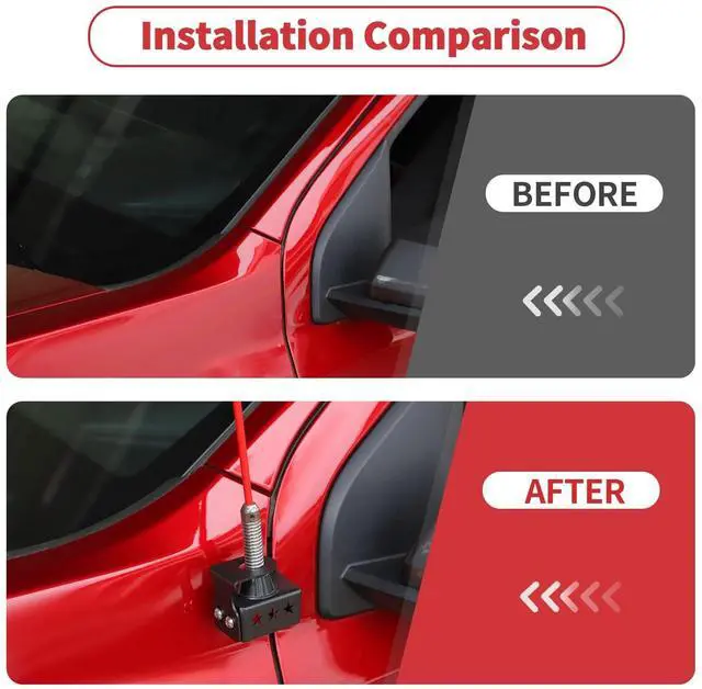 ^^ Simple Installation: 1. Remove factory bolts. 2. Align and fix the antenna mount. 3. Tighten the nut with a wrench. 4. Place the side component mounts. 5. Tighten the screws.