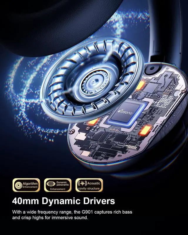 Deep Bass: Equipped with custom 40mm dynamic drivers, G901 over-ear headphones deliver High-quality audio with balanced deep bass and crisp highs. Whether wireless or wired (via 3.5 mm AUX), enjoy studio-quality sound with enhanced clarity and detail, perfect for music, movies, and gaming ^^ Ultra-Long 60-Hour Music Playtime & 40H