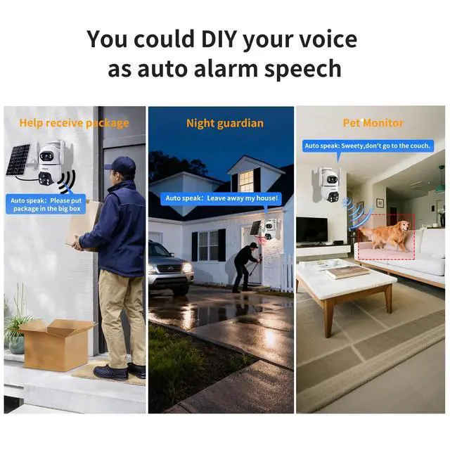 The lower lens: supports 330 horizontal rotation and 90 vertical rotation, you could remote rotate camera view angel in your app. No blind spots you could. With 90-degree wide-angle, the ptz camera outdoor guarantees a panoramic shot of every corner of your front door, back yard, shop, garage. ^^ Customize Alarm & Smart recording time & IP65 Weatherproof When the camera detects the movement, you could set it auto alarm, you could record your own voice like: stay away or welcome voice as a alarm voice. suitable for when you are at vacation in another city, help you scared away invade. This smart security camera, it records untill te motion is end, up to 6mins for 1 video, you could see the whole action, not just a clip. This IP66 weatherproof camera withstands rain, snow and high temperatures.