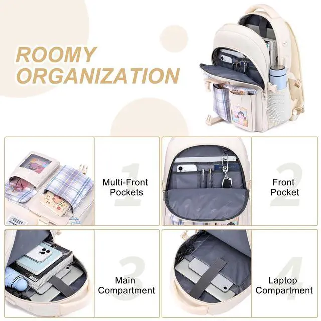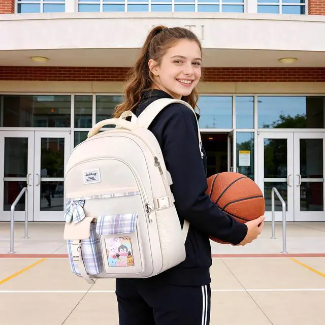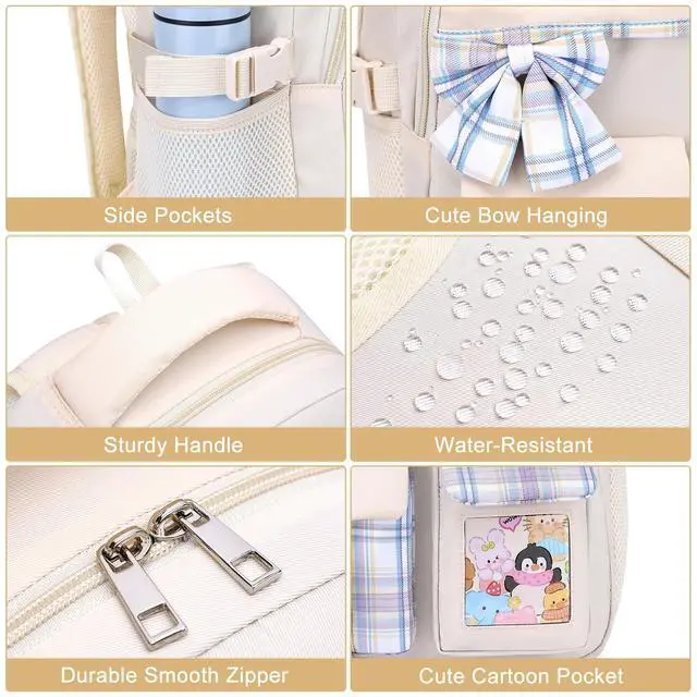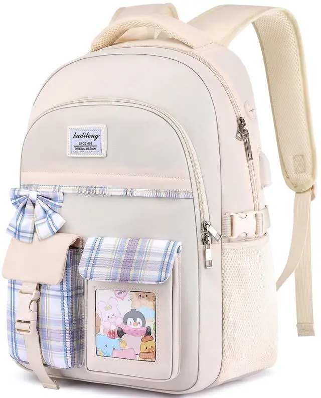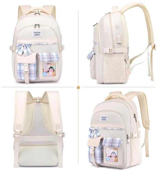 Cute Design for Cute GirlsThis bookbag is designed with many kawaii elementary, cute ribbon + cute animal card + lovely color-matching. Padded shoulder straps provide relief for girls with carrying heavy loads, functional and fashionable. ^^ Enough Storage for School SuppliesMeasuring 7.08 x 16.93 x 11.81 in with One laptop compartment hold 15. 6 Inch Laptop and one pocket for 9.7 Inch tablet. Main compartments for organizing school supplies, travel accessories, and small front pocket for pens and notes. ^^ Earphone & USB Charging PortExternal USB interface and built in charging cable inside offer you a hand-free way to charge your phone while walking.