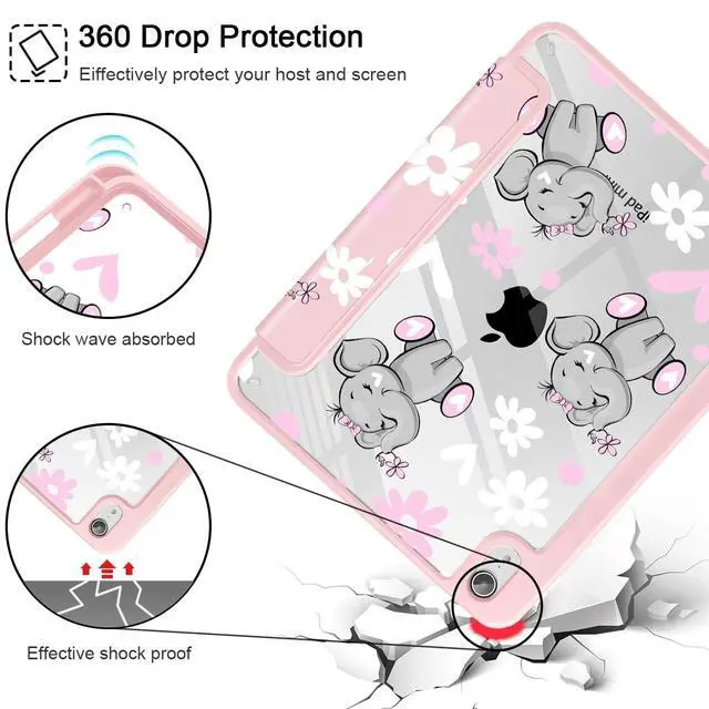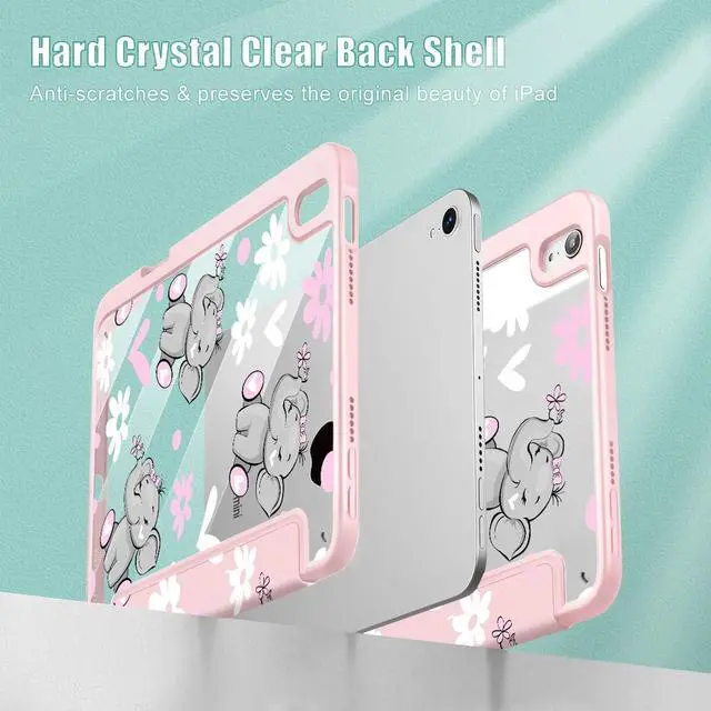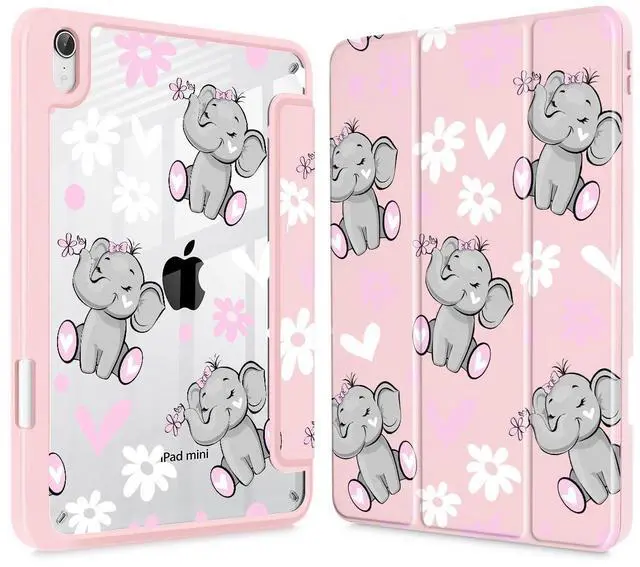 May Chen Slim Case for iPad mini 7 (A17 Pro, 7th Generation) 2024 / iPad mini 6 (6th Gen) 8.3 Inch, [Built-in Pencil Holder] Shockproof Cover Clear Clear Back Shell Auto Wake/Sleep, Cute Elephant