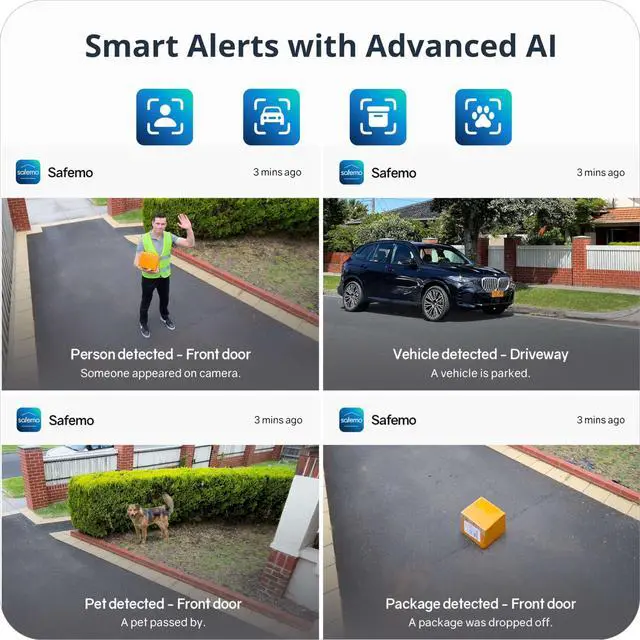 Privacy-Focused & No Subscription: Protect your data securely in local storage. Safemo 4K wireless security camera system ensures privacy with SafeRTC encryption and local processing. Store 6+ months of recordings on 32GB built-in storage (expandable to 4TB), with no monthly fees or hidden costs. Control your personal data like a vault: avoid cloud storage, prevent data leakage ^^ 4K Ultra HD & Full-Color Night Vision: Experience crystal-clear video quality with 4K (38402160) and 8 zoom, capturing faces and license plates with precision, day or night. The f/ 1.6 lens and 140 wide-angle view help reduce blind spots, while advanced full-color night vision (up to 40ft) reveals potential threats in vivid detailnot just grainy shadows. The motion-activated spotlight enhances visibility, deters intruders, which further secures your home ^^ AI Smart Detection & Instant AlertsTired of meaningless alerts? Our smart security cameras reduce false alerts with AI-powered motion detection that accurately recognizes people, pets, vehicles, and packages. With a 30ft detection range, custom monitoring zones, and real-time notifications via the Safemo App, youll always be alerted to what matters most. No more unnecessary alertsonly real threats ^^