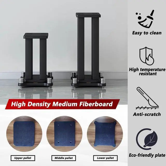 Wide Compatibility -- Bookshelf speaker stands Equipped with a spacious top plate of approximately 9.84 x 11.81 inches, supporting up to 40 kg/88 lbs, it is compatible with most satellite speakers, bookshelf speakers, and monitor speakers, and supports most mainstream brands and models, meeting the needs of both home and professional scenarios ^^ Professional Sound Quality Optimization -- Speaker stands for large speakers Utilizing high-density board and an all-steel composite structure, it effectively dampens vibrations. The steel structure supports sand filling to enhance vibration damping, effectively reducing sound coloration, making mid-high frequencies more transparent and low frequencies more solid, improving professional monitoring accuracy ^^ Detailed Protective Design --Studio monitor stands top plate is equipped with EVA anti-slip pads to prevent the speaker from sliding and avoid scratches on the bottom of the cabinet; the bottom feet use shock-absorbing spikes and pads to prevent damage to the ground and extend the life of the stand and furniture ^^ Multiple Height Options -- speaker stands pair Offering multiple height options from 7.8 to 31.4 inches, whether on a low sofa or a high chair, the speaker can be easily positioned at the golden listening height, clearly presenting vocals, instrument sounds, and sound effect details, creating a personalized immersive sound field ^^ Easy to install and versatile -- Floor speaker stands Comes with a complete set of installation hardware and clear instructions, making assembly easy; features teak grain or black coating design, blending into various home styles such as modern and classic, suitable for living rooms, bedrooms, studios, and other settings