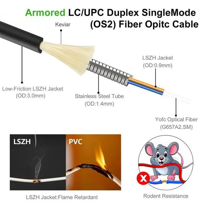 Armored Protection & LSZH Jacket: Our network fiber optic cable features a stainless steel tube for robust armor, shielding against damage from pets and harsh environments. Encased in a Low Smoke Zero Halogen (LSZH) jacket, it's flame retardant, anti-corrosive, and resistant to electrical interference. With an aramid inner layer enhancing tensile strength, these cables operate from -40C to 80C, resisting pressure and wear. Built tough for enduring outdoor performance.