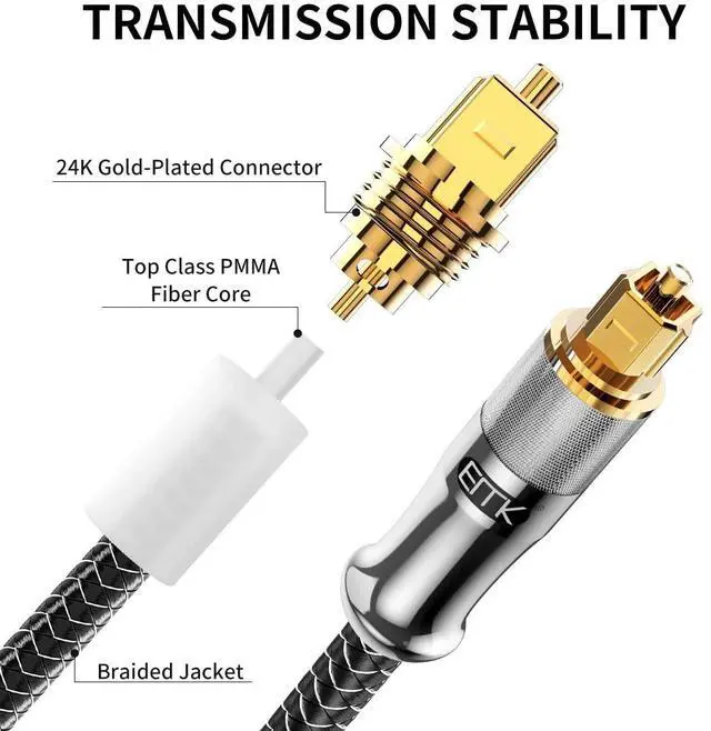 Cable Stands Out: Seamless Soundbar to TV ConnectionThe ideal optical cable for soundbar to TV setups, delivering synchronized audio without lag or compression. True Digital Audio FidelityAs a high-performance optical audio cable, it transmits uncompressed PCM audio (supports 5.1 / 7.1 surround). 24K Gold-Plated Toslink ConnectorsPrecision Toslink optical cable design ensures zero signal loss at the joints. Universal CompatibilityWorks with all digital audio optical cable ports: Soundbars; Smart TVs; PlayStation/Xbox; Blu-Ray Players.