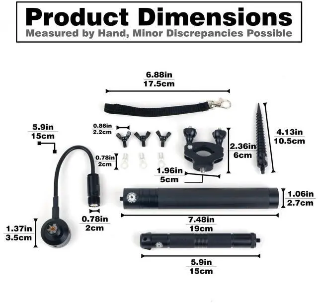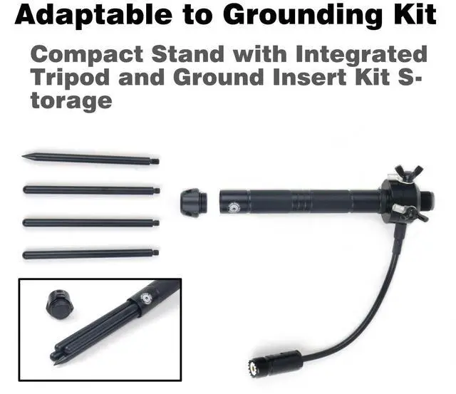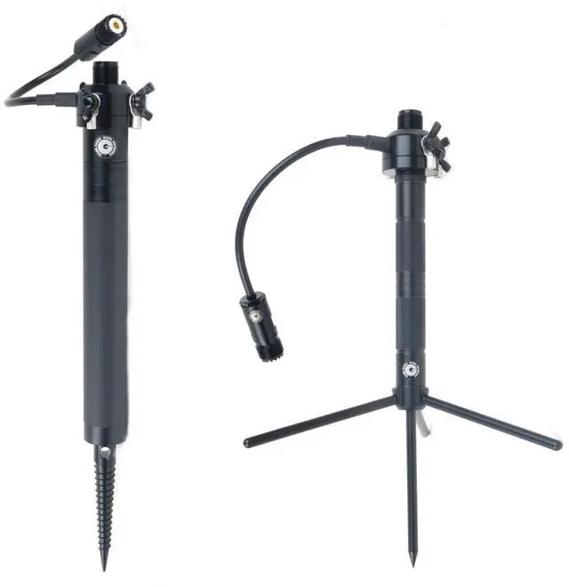 ^^ Versatile Components: Inside the container, you'll find a mini tripod, hand-twist and hammer-driven ground spikes, an extendable pole, a UHF connector, and a locking device for pole mounting. These components can be used to create various setups.