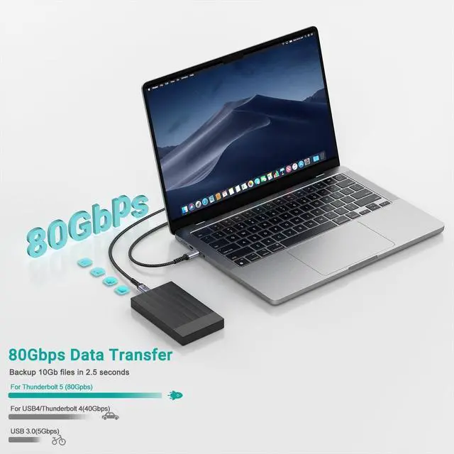 Thunderbolt 5]: The 80Gbps Data Cable is much faster and backward compatible with USB 4.0, USB 3.2, USB 3.1, USB 3.0, USB 2.0 etc. The cable is compatible with Thunderbolt 5 which could transfer high-resolution videos and intricate 3D models, minimizing waiting times and maximizing productivity. It's a perfect choice for professionals and enthusiasts who seek the ultimate data throughput for their workflows ^^ [16K or Dual 8K