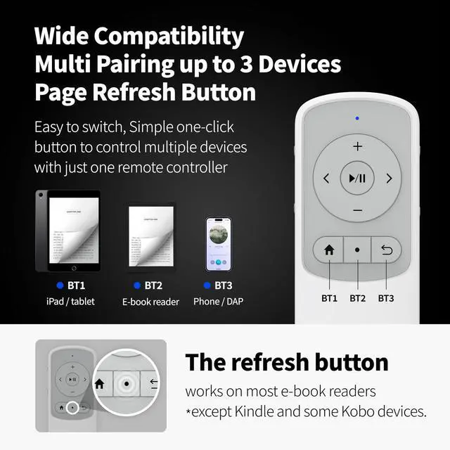 For the best experience with our remote control, please skip the iPad iOS 26.3 update and wait until corrected iOS is released. Bluetooth Multi-Pairing up to 3 Devices No longer need to buy multiple remote controllers. With a Multi-paring function, it is easy to switch between up to 3 devices including your tablet, phone and e-reader. Simple one-click button to control multiple devices with just one remote controller. ^^ Wide Compatibility This remote controller has wide Compatibility with Various Devices and Apps. With Bluetooth connection, it works for Onyx Boox, most e-Readers (Bluetooth support), iPad iPhone & Android Devices Galaxy Phone Tablet, and various Bluetooth support devices.