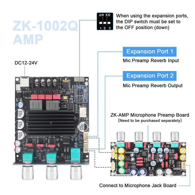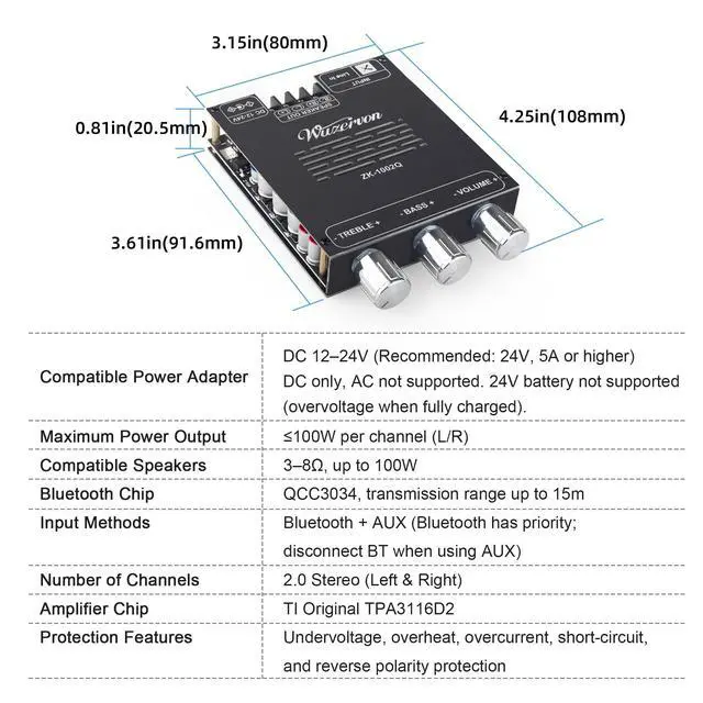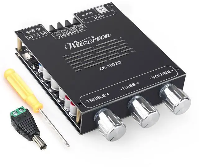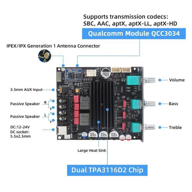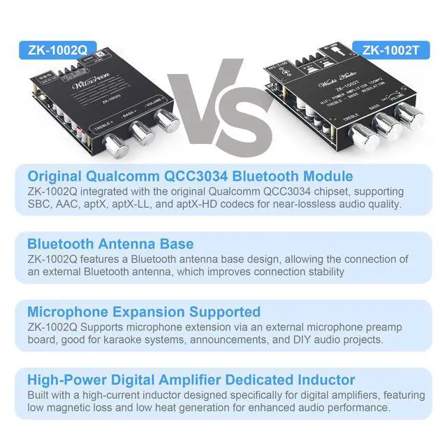Qualcomm QCC3034 ModuleUpgraded from ZK-1002T, this amplifier supports SBC, AAC, APTX, APTX-LL, and APTX-HD, and is equipped with Qualcomm QCC3034 for low-latency, high-fidelity audio. ^^ TPA3116D2 ChipHigh-performance dual TPA3116D2 Class-D chips deliver 100W+100W of crisp, high-fidelity audio with minimal distortion and efficient power usage, support a wide 1224V DC input, perfect for home or car audio systems ^^ Bluetooth Antenna BaseZK-1002Q features a Bluetooth antenna base design, allowing the connection of an external Bluetooth antenna, which improves connection stability ^^ Enhanced Audio PerformanceEquipped with original TI NE5532 operational amplifier and a high-current inductor designed for digital amplifiers, featuring low magnetic loss and low heat generation for enhanced audio performance.