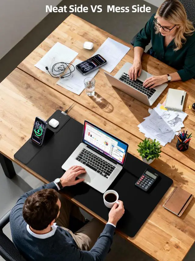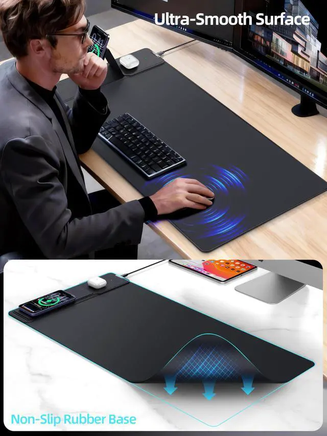 Built-in safeguards: overheat, overcurrent, overvoltage protection ^^ Smart Dual Charging ZonesCharge your phone and earbuds simultaneously. Dedicated charging areas ensure perfect alignment every timeideal for powering up both devices while you work or game ^^ Ultra-Smooth, Waterproof, DurableExpansive 31.5" x 15.8" surface made of smooth, waterproof micro-woven fabric for flawless mouse tracking and easy cleaning. Non-slip rubber base stays firmly in place; reinforced stitching prevents fraying for long-term durability ^^ What's Included1x Wireless Charging Desk Mat with Foldable Phone Stand, 1x 6.56 ft Braided USB-C Cable, 1x 20W Power Adapter, 1x User Manual. Backed by 24-month warranty & 24/7 customer support