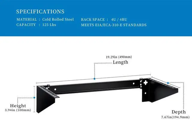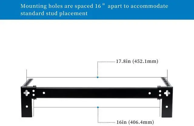 • Dimensions: 3.94 in H x 19.3 in W x 7.67 in D; the wall mounting holes on the rack are spaced 16 inches center to center for greater stability, matching standard construction framework