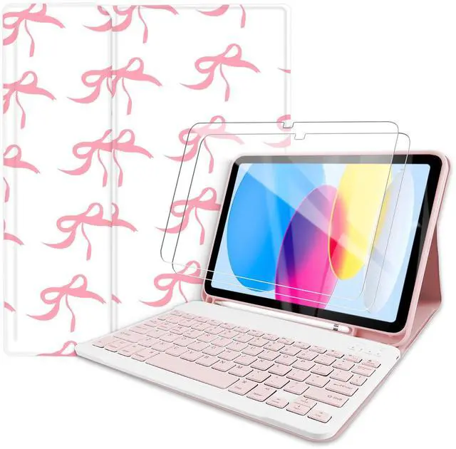 TopPerfekt with Bluetooth Keyboard for iPad 10th Gen 10.9'' 2022 case (A16) 11th/10th Gen Case 11''2025 Case with Screen Protector, Pencil Holder with 2 Pack 9H Hardness Tempered Glass, White-Pink Bow
