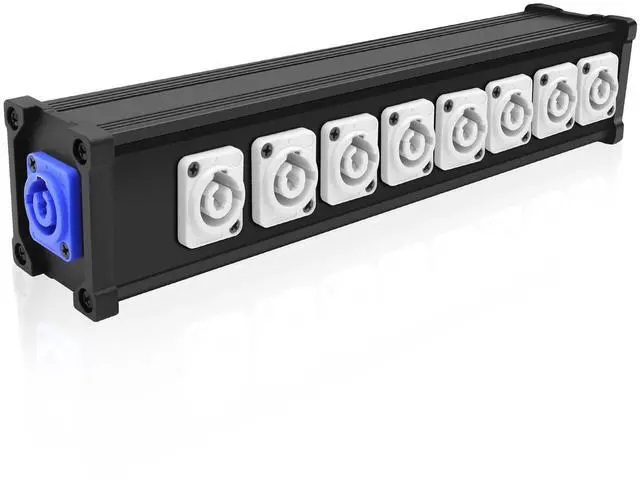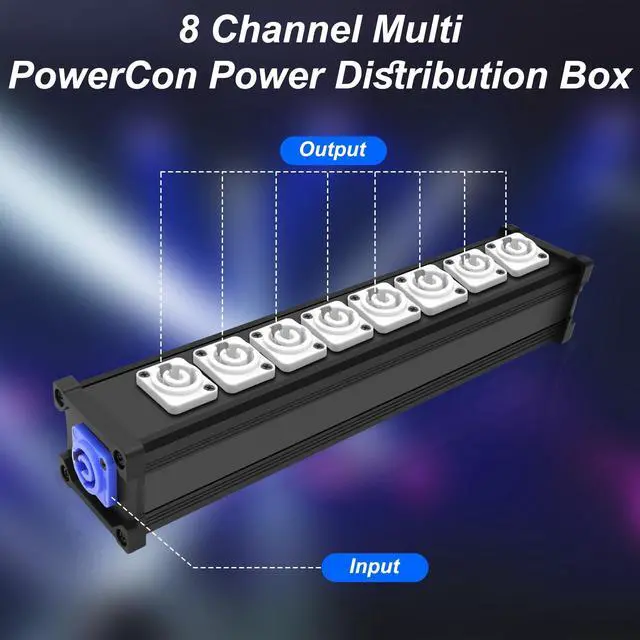 This 8-channel multi PowerCon power distribution box is specifically engineered for stage lighting applications, enabling efficient and organized power distribution for stage luminaires and LED displays. It consolidates multiple independent cables into a streamlined, secure, and reliable system. Each channel is rated for a robust 20A power supply, capable of simultaneously supporting multiple devices to meet the demands of professional environments. ^^ The PowerCon Input to Powercon Output distributor is constructed from aluminum alloy, offering excellent thermal dissipation, electrical insulation, flame retardancy, high-temperature tolerance, and resistance to corrosion.