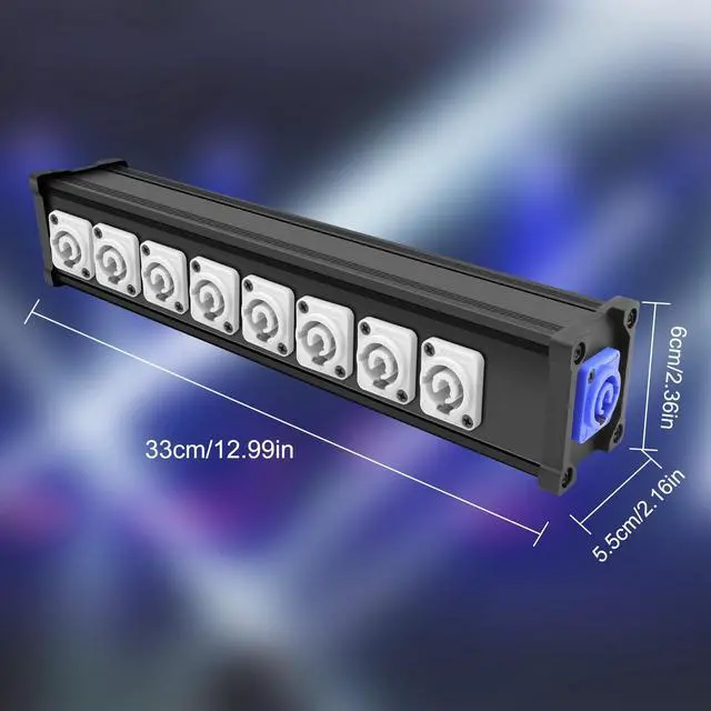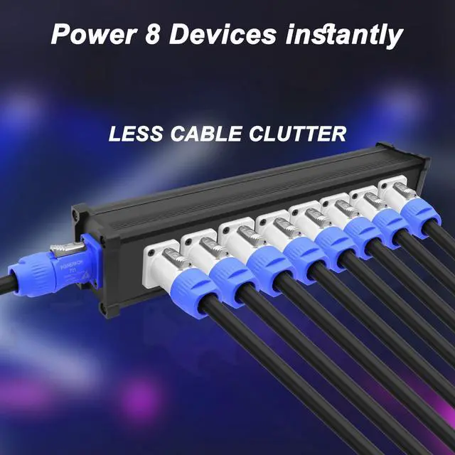 ^^ The 8-way PowerCon power center socket supports the connection of multiple stage lighting devices, including lighting consoles, moving head fixtures, haze machines, media servers, and stage monitors.