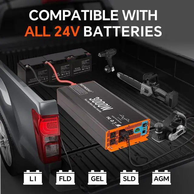 LCD display can show: input/output voltage, battery capacity, load capacity, error code. Easily and intuitively track the operating status of all inverters to make troubleshooting easier. You can also access troubleshooting information from the LCD display to adjust the inverter and battery. ^^ Comprehensive Safety ProtectionEquipped with cooling fans, LED indicators and built-in fuses. Providing battery over-voltage, battery under-voltage, battery reverse, output overload, output short-circuit, high-temperature protection, etc. ensure that in the process of use of comprehensive security. Dual high-efficiency cooling fans maintain optimal operating temperatures, ensuring stable performance under demanding conditions while reducing battery consumption and extending battery life. ^^ Multiple Outlets & Adaptable All BatteriesThis 3000W power inverter provides 120V AC outlets with continuous DC to AC power output with PD20W powerful outputs, converts 24V DC battery power to standard 120V AC, featuring 4 AC outlets, one 3.0A USB ports, one Type-C ports. It is your van, truck, RV in the outdoor ideal power supply equipment! It's ideal for off-grid solar, trucks, homes, RVs, boats, travel, camping, and outdoor AC use.