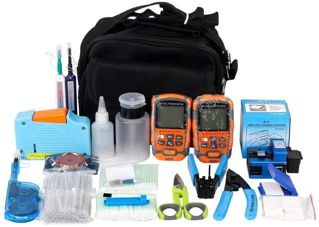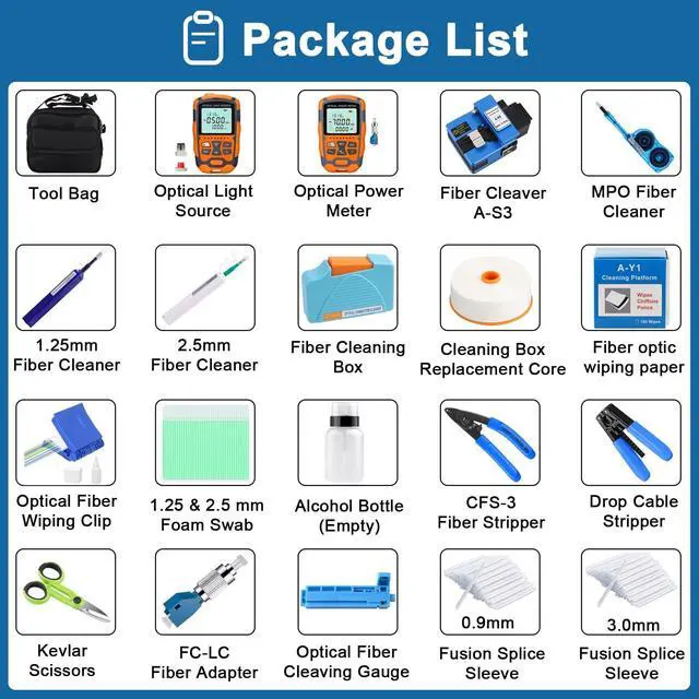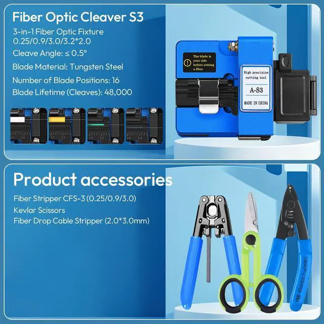 [Cleaver] The three-in-one clamp is suitable for 3mm leather cable, 900um pigtail fiber, and 250mm bare fiber. Automatically reset blade. The cutting angle is about 0.5. Cutting times about 48000 times. Comes with anti fall storage bag.