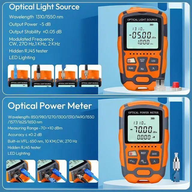 [OLS] Singlemode dual wavelength: 1310 / 1550nm, output power: -5dB, output stability: (0.05dB / 15min; 0.1dB / 8h), modulated frequency: CW, 270Hz, 1KHz, 2KHz. Powered by 2 AAA batteries (not included). Built-in LED lighting & hidden RJ45 network cable sequence verification function. Comes with SC & FC connectors.